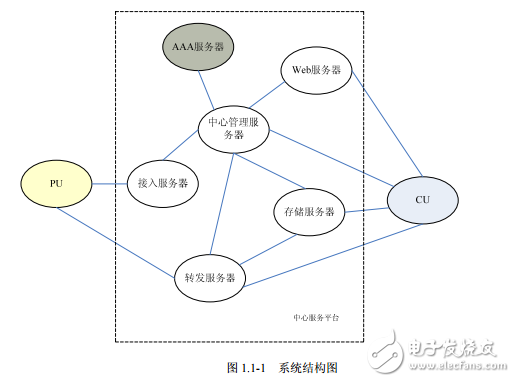 系统的总体结构包括前端设备(PU)、客户端(CU)和中心服务平台。其中中心服务平台包括中心服务器、接入服务器、存储服务器、转发服务器、AAA 服务器、 Web 服务器。各部分通过 IP 网络互连,如图 1.1-1 所示。 1. 前端设备包括视频编码器、摄像头、云台、DI/DO 等设备,用于音视频信息、告警信息的采集、编码、存储和发送,并且能够接受配置命令。 2. 接入服务器用于管理多种前端设备。负责采集接收前端设备的告警,转发用户的控制和配置指令,同时监控前端设备的运行情况。 3. 转发服务器用于音视频数据的请求、接收、转发和分发。支持多个级联,支持按照路由请求视频数据,完成计费原始信息采集,可支持多种视频传输协议。 4. 存储服务器用于视频录像、录像文件检索、下载和回放。据有和转发服务器类似的视频请求和接收功能。 5. 中心管理服务器可实现客户端接入、网内设备监控和维护、信令和告警转发、以及系统和其他信息管理。6. Web 服务器为浏览器用户提供视频浏览以及简单的系统管理功能。方便用户访问。 7. AAA 服务器为用户认证、授权和计费服务器。 8. 客户端包括 Web 客户端、监控管理软件和综合管理业务台,主要用于为不同的用户呈现系统所提供的服务。包括实时、历史音视频数据的解码、控制,实现接警、系统维护、管理等功能。