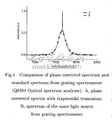 在光纤傅里叶变换光谱仪(FFTS)中由于抽样误差和光纤色散等原因引起相位误差导致谱线畸变。乘积法在频域实现相位误差校正,通过短双边干涉图和单边干涉图分别计算出低分辨率和高分辨率的相位谱及幅度谱,并用两个相位谱差的余弦乘以高分辨率的幅度谱得到相位误差校正的谱。讨论了两种截断函数情况下用乘积法计算得到相位误差校正后的光谱。相位校正后的谱和标准谱线比较,二者基本重合。在光纤色散存在的条件下,乘积法仍然有效地消除了谱图中相位误差,证明了FFTS中乘积法校正相位误差的有效性。该方法比双边干涉图法具有较高的光谱分辨率,光谱的基线并不会因噪声而升高,且比卷积法计算简单、速度快、实时性好,可广泛应用到FFTS中。