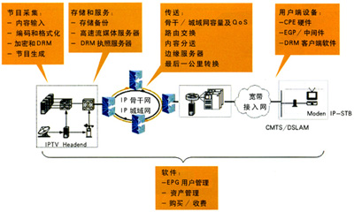 此外,为了提高对IPTV节目流点播的响应和传输实时性,以及解决或减缓IPTV点播请求之冲击性和波动性对IPTV前端设计容量所造成的压力,IP骨干网和IP城域网上普遍采用了内容分送网络威廉希尔官方网站 。IP骨干网和IP城域网也可以采用不同的低层物理网,以IP over SDH/SONET(即Packet over SDH/SONET),IP over ATM或IP over DWDM Optical(如千兆/万兆光以太网)的方式提供传输服务。有线电视前端或电信中心站则根据相应的宽带接入网络,如Cable Modem网络或DSL网络将IP视音频流媒体节目流以IP over DOCSIS或IP over DSL的方式,通过放在有线电视前端的CMTS鉴定或电信中心站的DSLAM设备,向用户发送出去。有线电视前端或电信中心站还往往配备有视音频流媒体节目流内容服务器和DRM授权/密钥服务器,具有节目存储和服务功能。