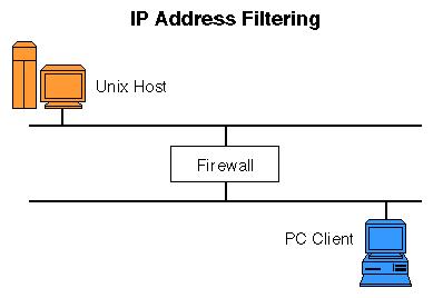 所有的防火墙都具有IP地址过滤功能。这项任务要检查IP包头,根据其IP源地址和目标地址作出放行/丢弃决定。看看下面这张图,两个网段之间隔了一个防火墙,防火墙的一端有台UNIX计算机,另一边的网段则摆了台PC客户机。