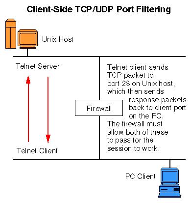 当PC客户机向UNIX计算机发起telnet请求时,PC的telnet客户程序就产生一个TCP包并把它传给本地的协议栈准备发送。接下来,协议栈将这个TCP包“塞”到一个IP包里,然后通过PC机的TCP/IP栈所定义的路径将它发送给UNIX计算机。在这个例子里,这个IP包必须经过横在PC和UNIX计算机中的防火墙才能到达UNIX计算机。