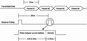 通常,钥匙发射器连续发射4个10ms数据流,以保证接收器至少能捕获到其中一个数据流。接收器每20ms要查询一次,跳跃到译码至少2个数据流,以保证定时误差和噪声容限。需要0.75ms译码时间(对于7或8位接收数据此时间足以满足要求)来确定数据是否是重要的。