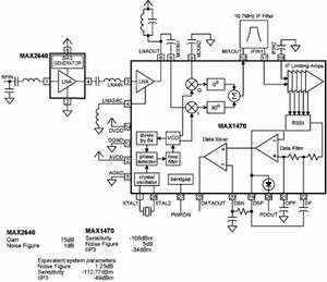 低发射功率受FCC规范、电池容量和发射天线定位(要求在RKE接收器芯片中有最大的灵敏度)的不确定性所限制。增强接收器灵敏度的一种方法是增加一个外部低噪声放大器(图3),但是,动态范围的限制,使这种方法在应用中是不能接受的。下面是基于MAX1470超外差接收器的分析。