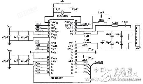 RFID 射频读写器硬件电路原理如图2所示。为了驱动天线,MF RC500通过TX,和件2提供13.56 MHz的能量载波。根据寄存器的设定对发送数据进行调制得到发送的信号。射频卡采用RF场的负载调制进行响应。天线拾取的信号经过夭线匹配电路送到RX 脚。MF RC500内部接收器对信号进行检测和解调并根据寄存器的设定进行处理,然后数据发送到并行接口由微控制器进行读取。使用内部电路产生的VMID电压作为 RX引脚的输人电压。为了提供稳定的参考电压,在VMID引脚与地之间应接入一个电容,在引脚VMID与RX之间需接人一个分压电阻,另外,在天线与分压电阻之间加人一系列电容也会提高电路的性能。
