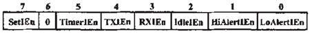 MF RC50 0具有计时器中断、发送中断、接收中断、闲置中断等6个中断源。通过对中断允许寄存器的设置可以使能中断请求。SetIEn为中断允许位,将该位置1时,该寄存器内其它的中断控制位有效。 TimerlEn,TxIEn,Rx lEn分别为计时器中断允许、发送中断允许和接收中断允许控制位,如图6所示。中断允许寄存器的地址为0x06,初始值为OOOOOOOO,Ox00o