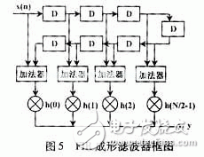 5 研究了一种采用FPGA实现32阶FIR滤波器硬件电路方案;讨论了窗函数的选择、滤波器的结构以及系数量化问题;研究了FIR滤波器的FPGA实现,各模块的设计以及如何优化硬件资源,提高运行