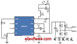 图3 LM3409在12VAC电源供给下驱动一个单封装LED阵列