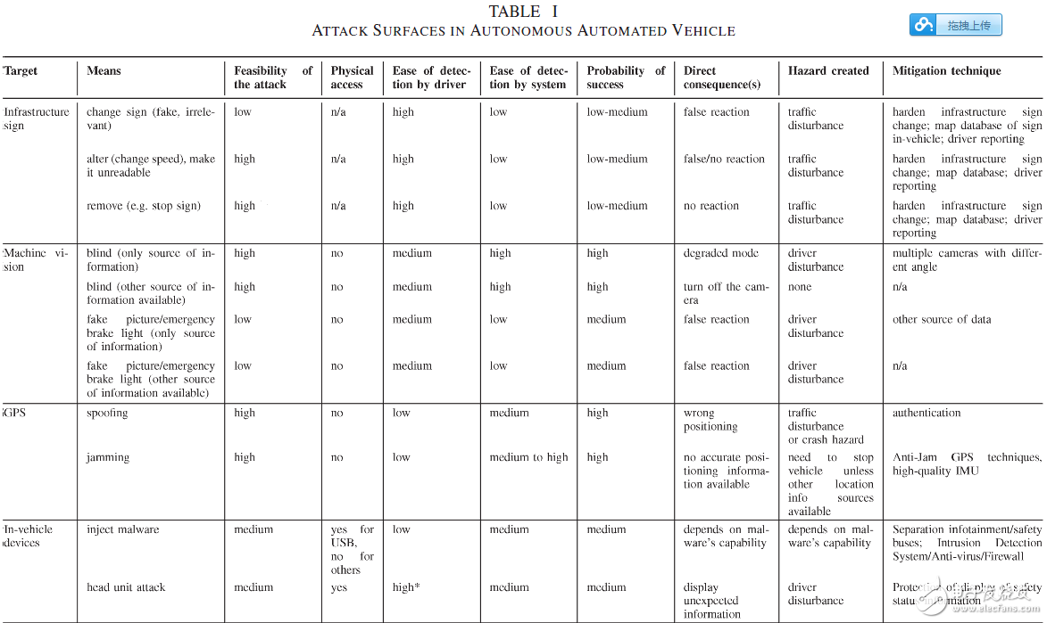 人车潜在的被攻击风险,列出了12种无人车可能被攻击的对象。