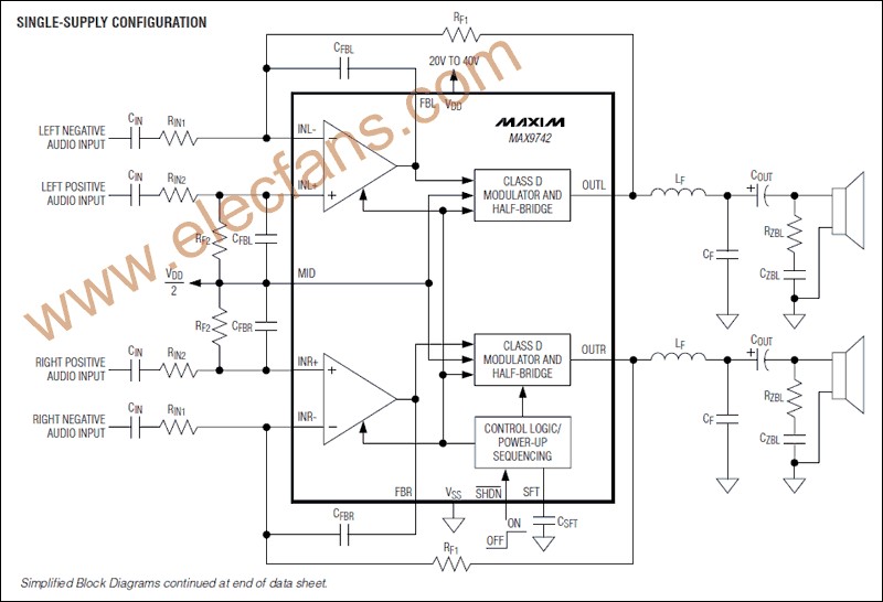 高达87%的效率。MAX9709具有AB类放大器的性能,兼具D类的效率优势,省去了体积庞大的散热器并节省了功耗。MAX9709采用+10V至+22V单电源供电,以B