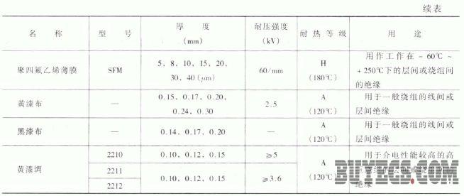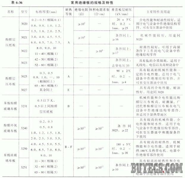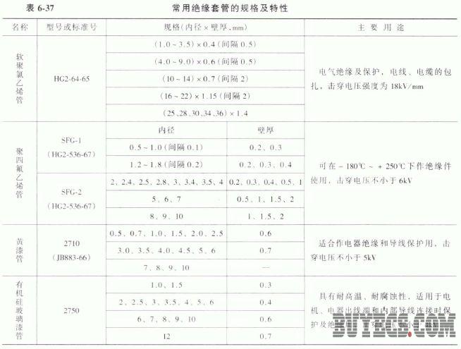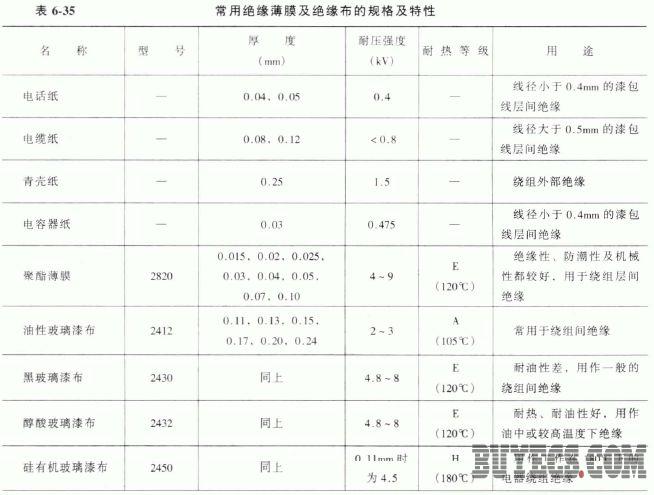 向表6-35 -表6-37 分别列出了常用的绝缘薄膜(布)、绝缘板材及绝缘套管的规格及特性参数。