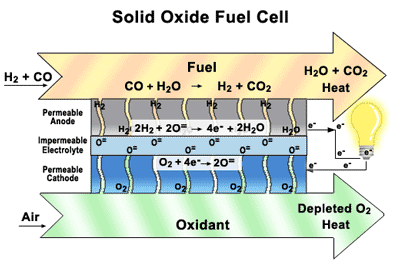 SOFC之原理如 上图所示,当空气通过阴极时,氧分子(O2)得到电子(e-)后变成氧离子(O2-)接着,氧离子在电解质隔膜两侧电位差与浓度驱动力的作用下,透过电解质隔膜中的氧空位,定向跃迁至阳极侧,并与燃料(如氢)及一氧化碳进行氧化反应,于单电池之电化学反应中,在使用氢气为燃料之情形下,为氢气之氧化生成水的反应,此即为水之电解的逆反应;若是使用一氧化碳为燃料的情形下,为一氧化碳之氧化生成二氧化碳的反应。