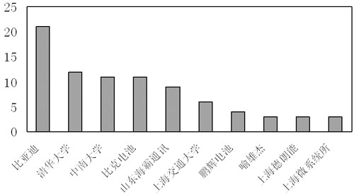 图2为专利申请人前10名排行示意图。比亚迪股份有限公司以22件专利申请居首,排在第10名的申请人中科院上海微系统所只有3件,甚至有自然人申请人排入前10名之中。在磷酸铁锂电池威廉希尔官方网站 领域,国内的专利申请人比较分散,大多只有1到3件专利,长期专业生产电池的比亚迪股份有限公司也并非该领域的专利大户。需关注的是,掌握核心威廉希尔官方网站 的几个国外企业并没有出现在前10名排行中。中国磷酸铁锂电池威廉希尔官方网站 领域的国外申请人只有日本的三洋电机株式会社(2件已授权)、株式会社杰士汤浅(1件已授权)。