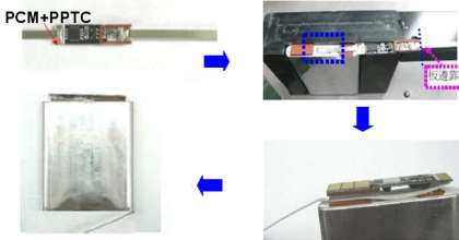 PPTC-自动性保险丝:这里所说的自动性保险丝也就是电热调节器,通常我们称之为自复式原件,他会连接电池的正负极或负极,以检测电池过压或过热的现象,当侦测到第一重保护也就是PCM失效时,自复式原件会自动开启。