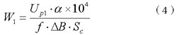 Up1为变压器输入电压的最小幅值230V,△B为增量磁感应强度0.2T,α为最大工作比0.45,Sc为磁芯截面积1.74mm2。