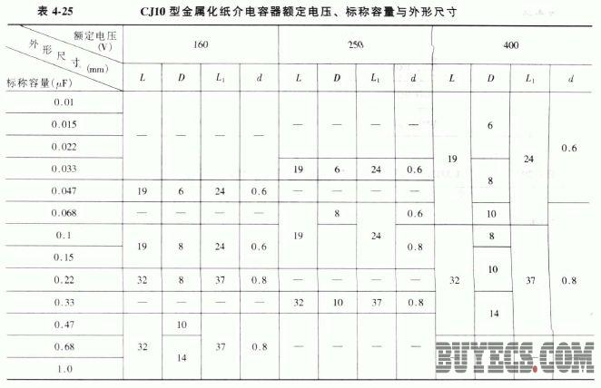 CJ10、CJ11型金属化纸介电容器适用于电子设备的直流或脉动电路中。它们的外形如图4-16 所示,其主要特性参数见表4-24 -表4-26。