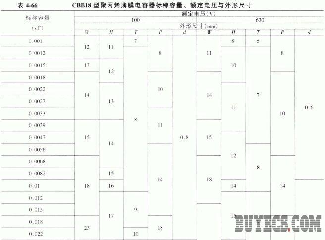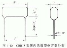 CBB18 型聚丙烯薄膜电容器具有耐脉冲性能好、损耗小、绝缘电阻高、能承受高频率大电流等特点,适用于节能灯、电子镇流器及其他电子仪器的交流(直流)及脉冲电路。其外形如图4-40 所示.主要特性参数见表4-65和表4-66。