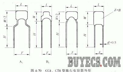 CC4 、CT4 型独石电容器采用1类陶资介质(NPO)或2类陶瓷介质(X7R 、Y5V) 高温烧结而成,可制成各种场合使用的电容器。其中CC4 型为1类瓷介电容器,适用于高频电路;CT4型为2 类瓷介电容器,主要用于低频电路。它们的外形如图4-70 所示,主要特性参数见表4-109 和表4-110。