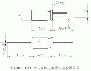 CA33 型高压非固体电解质钮电容器采用多芯结构.具有工作电压高、性能稳定可靠的特点,适用于直流或脉动电路,其外形见图4-105。