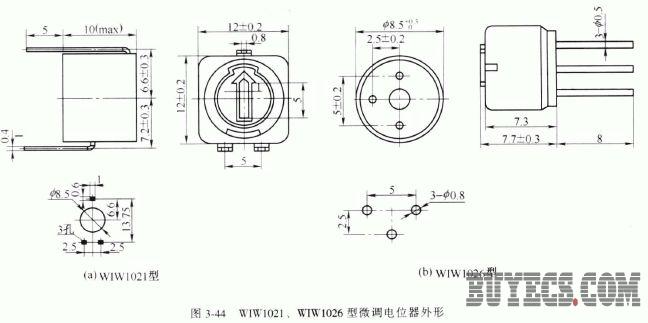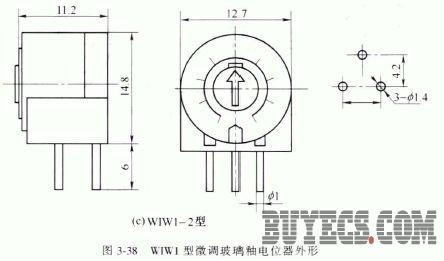 WI06A 、WI08C 型微调玻璃釉电位器的外形如图3-42 所示,它们的主要参数见表3-33 。