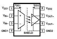 2、3脚为信号输入脚,1、4脚为输入侧供电端;6、7脚为差分信号输出脚,8、5脚为输出侧供电端。