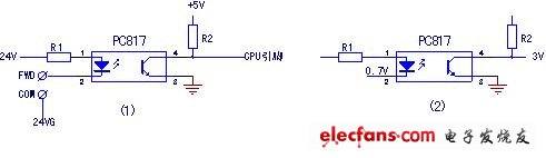 上图中的(1)电路,为变频器控制端子电路的数字信号输入电路,当正转端子FWD与公共端子COM短接时,PC817的1、2脚之间的电压由0V变为1.2V,4脚电压由5V变为0V。同理,当控制端子呈开路状态时,PC817的1、2脚之间电压为0V,而3、4脚之间电压为5V。图(1)电路可以看出光耦器件的各脚电压值,故障或正常状态测量输入、输出脚电压即可得出判断。