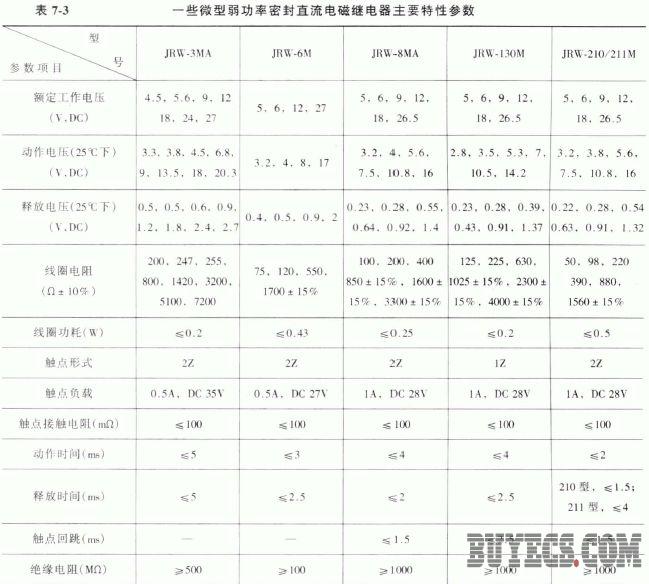表7-2 和表7-3 列出了一些微型电磁继电器的特点、用途及主要特性参数。图7-6 为它们的外形及电路。