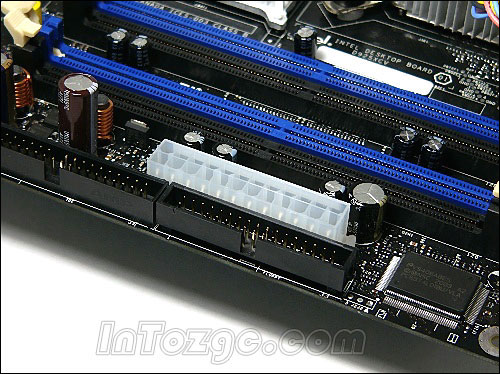 20针电源安装到上面,会空出4个接口。如果您熟悉服务器产品的话应该都知道,这种24针接口电源一直用在服务器上,现在915/925平台把它引进过来,应该是为了PCI Express X16接口做电源供应。根据资料来看,PCI Express X16接口最高可以应用75W功耗的显卡,其中一部分电力应该就是由这种服务器电源额外提供的。