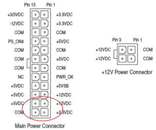 从上图可以看出来,24针电源较20针电源分别增加了+3.3V、+5V、+12V,还有一颗地线。