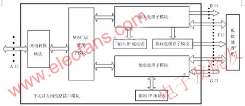 经过对十接口千兆以太网线路接口卡功能和性能需求进行认真分析,按照功能清晰、接口简单、实现容易的原则,设计了其实现方案,并按照设计方案对千兆以太网线路接口卡进行了子模块划分,共分为光电转换子模块、MAC层处理子模块、输入处理子模块、输出处理子模块、输入IP地址***模块、输出IP地址***模块和协议报文缓存子模块等七个子模块