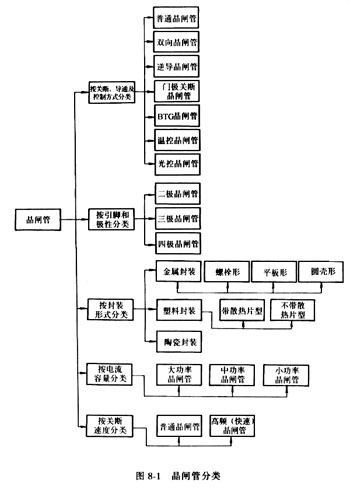 图8-1是晶闸管的分类图,图8-2是晶闸管的外形,图8-3是晶闸管的电路图形符号。