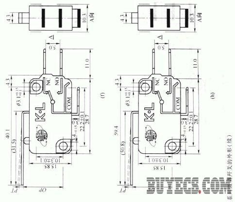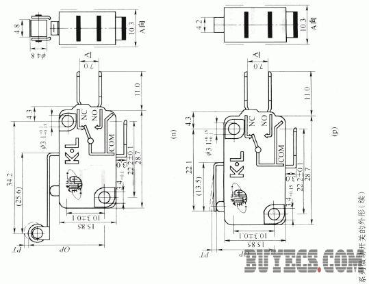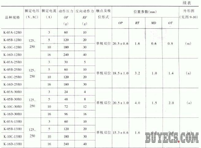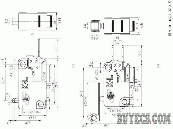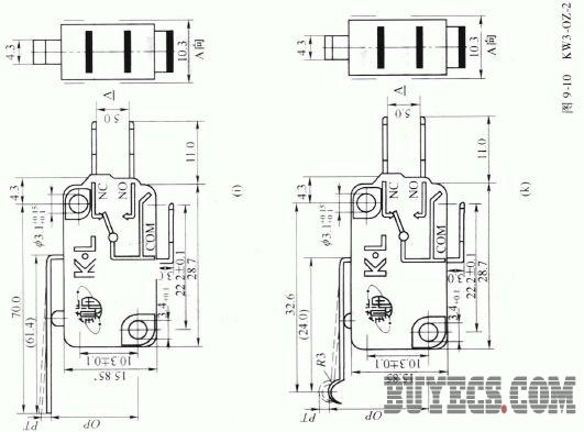 KW3-0Z-2 系列微动开关的测试参数见表9-11 ,特性参数见表9-12. 它们的外形结构见图9-10 。