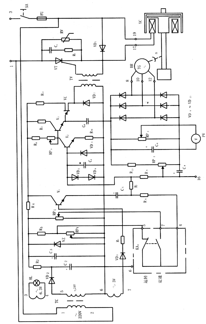 ①给定电压环节。给定电压环节起始于变压器TC副边5端、6端间的绕组。24V的交流电压经VD2、整流并经C2、R2、C3滤波和VZ稳压,得到16V的直流电压。最后由R5和RP4“定速”档的转速。“运转”、“定速”由中间继电器KA3控制。