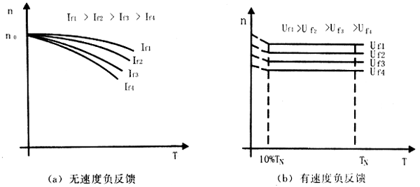 (2)当励磁电流一定时,从动部分转速将随着负载转矩增加而急剧降低,并且这种下降在弱励磁电流的情况下更加严重,如图2-20a所示,它具有较软的机械特性,这种软的机械特性在许多情况下,不能满足生产机械的要求。为了获得范围较广,平滑而稳定的的调速特性,通常采用速度负反馈的措施,使电磁滑差离合器具有如图2-20b所示的硬机械特性。