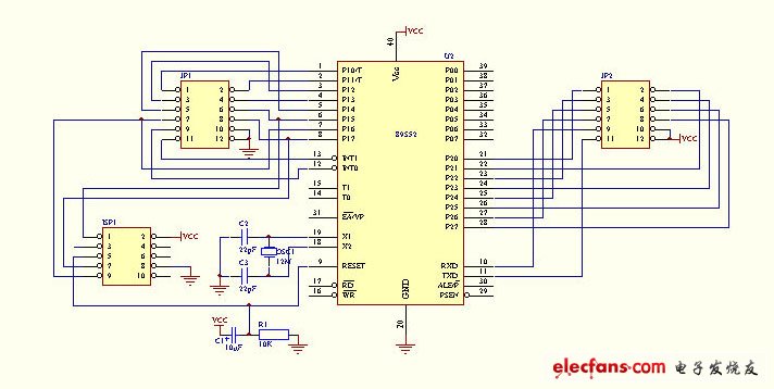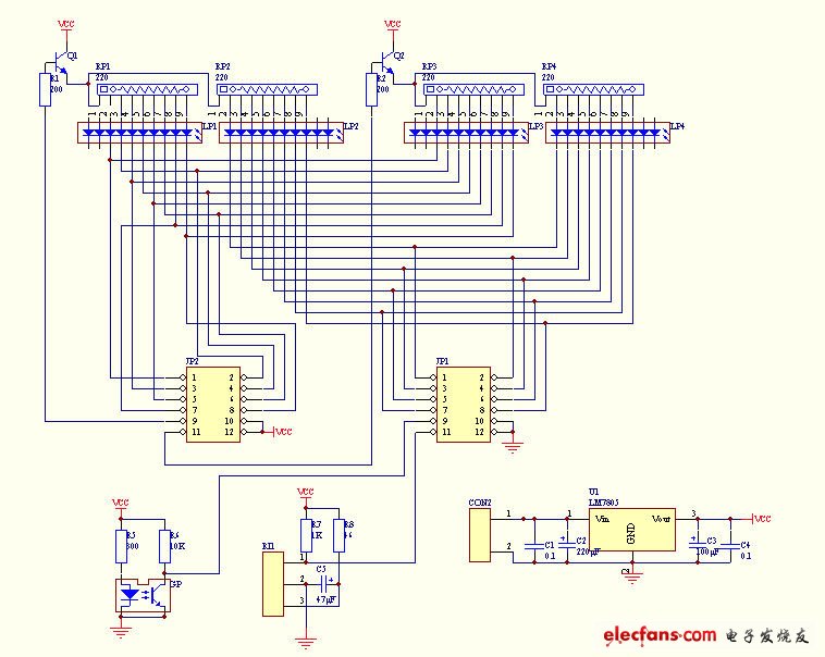 本项目的关键是如何解决高速旋转的电路板如何供电,如何调时的问题。我采用电机电刷的原理,将旋转轴钻空,通过一只插头将电源的从反面引到前面的电路板上,而这个旋转的插头又与固定在背板上的两个铜片接触的。调时的问题有些困难,一是让电路板在旋转前与PC机相接,由电脑传送调时数据,这虽然可行但不方便。还有就是用遥控方法,但此方案在调试方面有很大的困难。