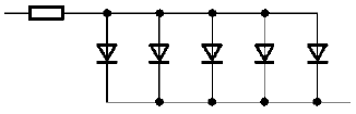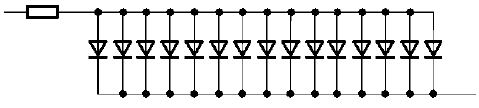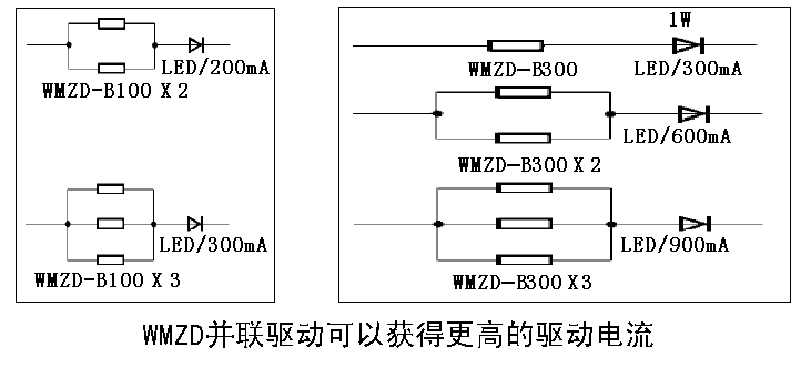 1只WMZD-B100与5只并联的LED (20mA)串联可以组成一个标准单元,它的LED恒流电流为100 mA,工作电压U=0.65V+3.4V=4.05V,0.65V是WMZD-B100的电阻压降,3.4V是LED后,短路电流可由600 mA迅速下降280 mA稳定值。 如果要增添LED的数量,可用多个标准单元并联组合,如下图2个B100并联可以驱动10个20mA的LED灯,如果要提高工作电压,可用多个标准单元的串联组合。如下图2个单元串联,供电电压为一个单元的2倍,依次类推。 WMZD-B100,WMZD-B300,WMZD-B350的扩展应用