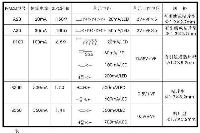 从图1可见,采用热敏电阻温度补偿方法与采用集成电路等元件组成的恒源相比,热敏电阻温度补偿法只用1个热敏电阻元件就可解决LED恒流源问题,其价格、体积、寿命等优势不言而喻。我们采用的这种正温度热敏电阻WMZD,专为LED应用而研制的,其常用规格见表1,下面介绍一下该热敏电阻的应用特性。