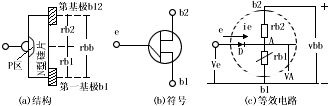式中:rb1----第一基极与发射结之间的电阻,其数值随发射极电流ie而变化,rb2为第二基极与发射结之间的电阻,其数值与ie无关;发射结是PN结,与二极管等效。