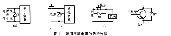 图1所示是采用压敏电压器进行电路浪涌和瞬变防护时的电路连接图。对于压敏电阻的应用连接,大致可分为四种类型:
