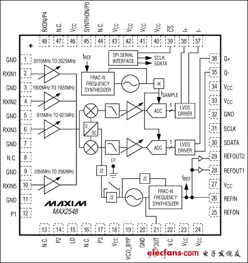 MAX2548采用独特的RF至比特流架构,集成了四个LNA、基带抗混叠滤波器、可编程基带放大器、宽动态范围的I和Q Σ-Δ模/数转换器(ADC)、用于产生本振(LO)的分数N分频频率合成器以及用于产生采样时钟的分数N分频频率合成器。采用1位数字Σ-Δ转换器对I、Q比特流进行调制,通过LVDS接口将数据传输至基带处理器/DSP。所有十进制编码、补偿和通道滤波均在数字域完成,符合MAX-PHY数字部分的规定。通过3线串行接口加载数据,可选择所要求的工作模式。