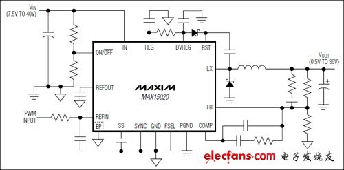 MAX15020高输入电压降压型DC-DC转换器可工作在7.5V至40V输入电压范围。器件集成了一个0.2Ω的高边开关,能以优异的负载和线路调整率输出2A负载电流。通过使用外部基准输入(REFIN)可在0.5V至36V范围内动态调整输出。关断模式下,MAX15020仅消耗6µA电流。